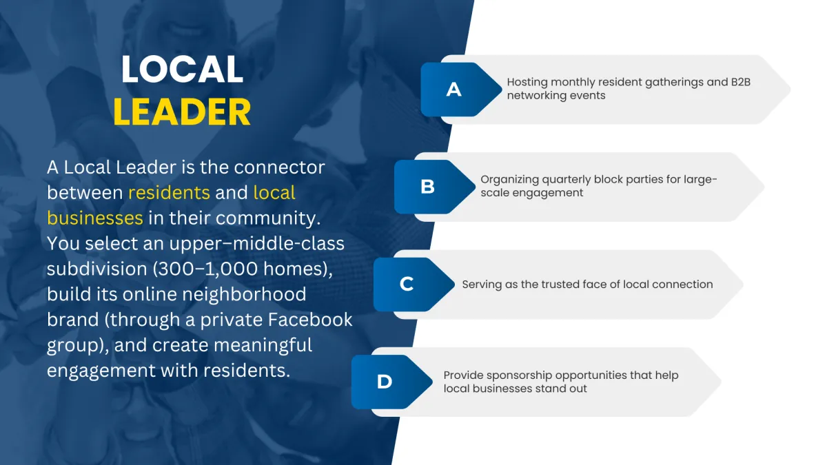 As a Local Leader, you don’t just connect businesses to residents—you connect them to each other, creating a network that lifts the entire community.